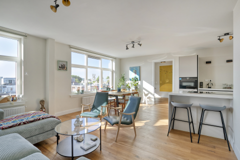 With three bedrooms, two luxury bathrooms, a modern open kitchen with island/bar, and a flexible home office/playroom, this property feels like a custom-designed family home. The sunny southwest-facing garden offers an ideal extension of the living space. Every detail has been finished to perfection, and with energy label A, you can enjoy sustainable living. The open kitchen is equipped with premium appliances, including a Quooker and an induction cooktop.